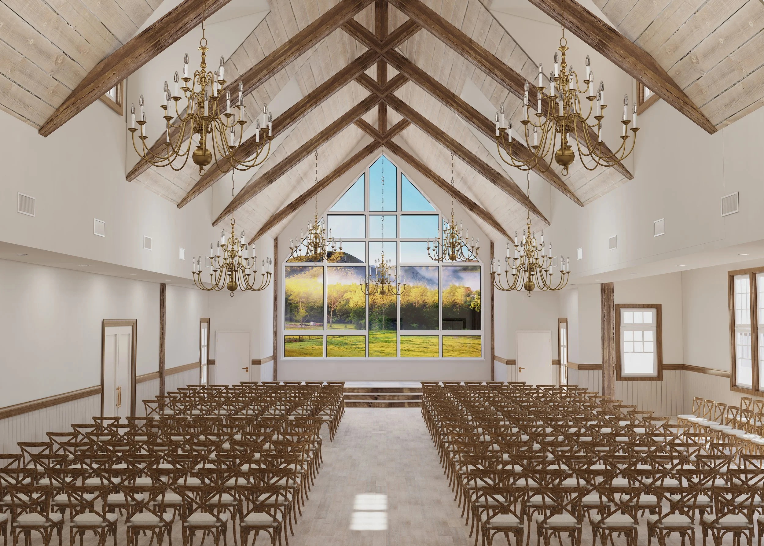 A sweeping grand staircase and glittering chandeliers set the stage for a magical celebration. Soaring windows showcase majestic mountain views, while a soft cream-and-ivory palette and warm wooden beams blend timeless elegance with rustic charm. From your first toast to the last dance, every moment feels unforgettable.